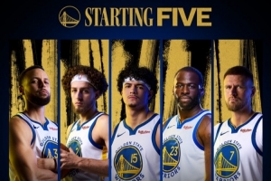 本场比赛勇士派出的首发是库里、波杰姆斯基、桑托斯、追梦、波尔津吉斯。